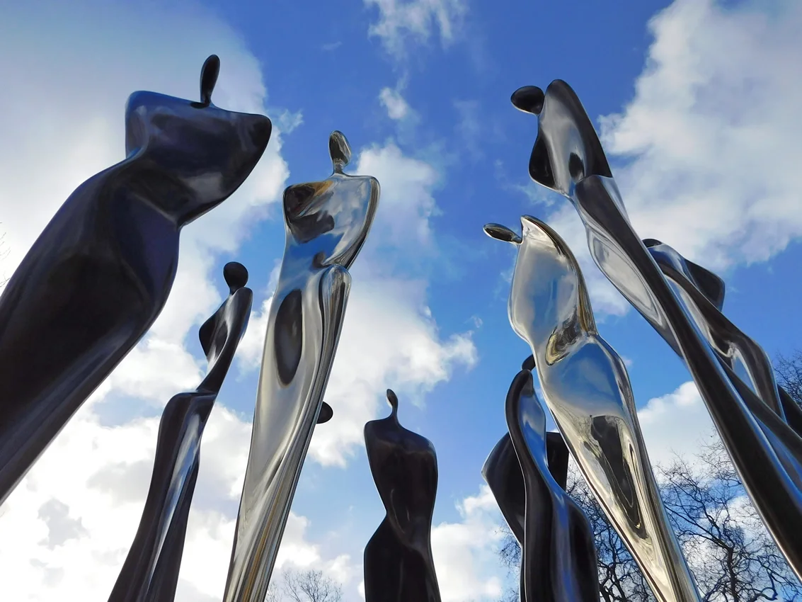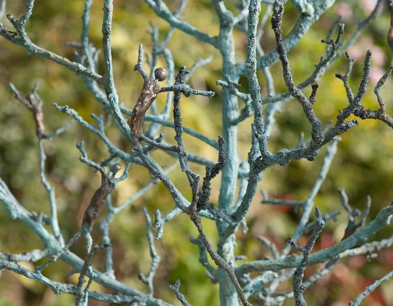 Cast in bronze from real apple branches, then composed into a new form, Tree of Life draws deep, archaic meaning from the biblical story of the Garden of Eden. Outstretched bodies reach up and intermingle with the branches in a celebration of life that depicts the joyful human spirit as fully interdependent with nature